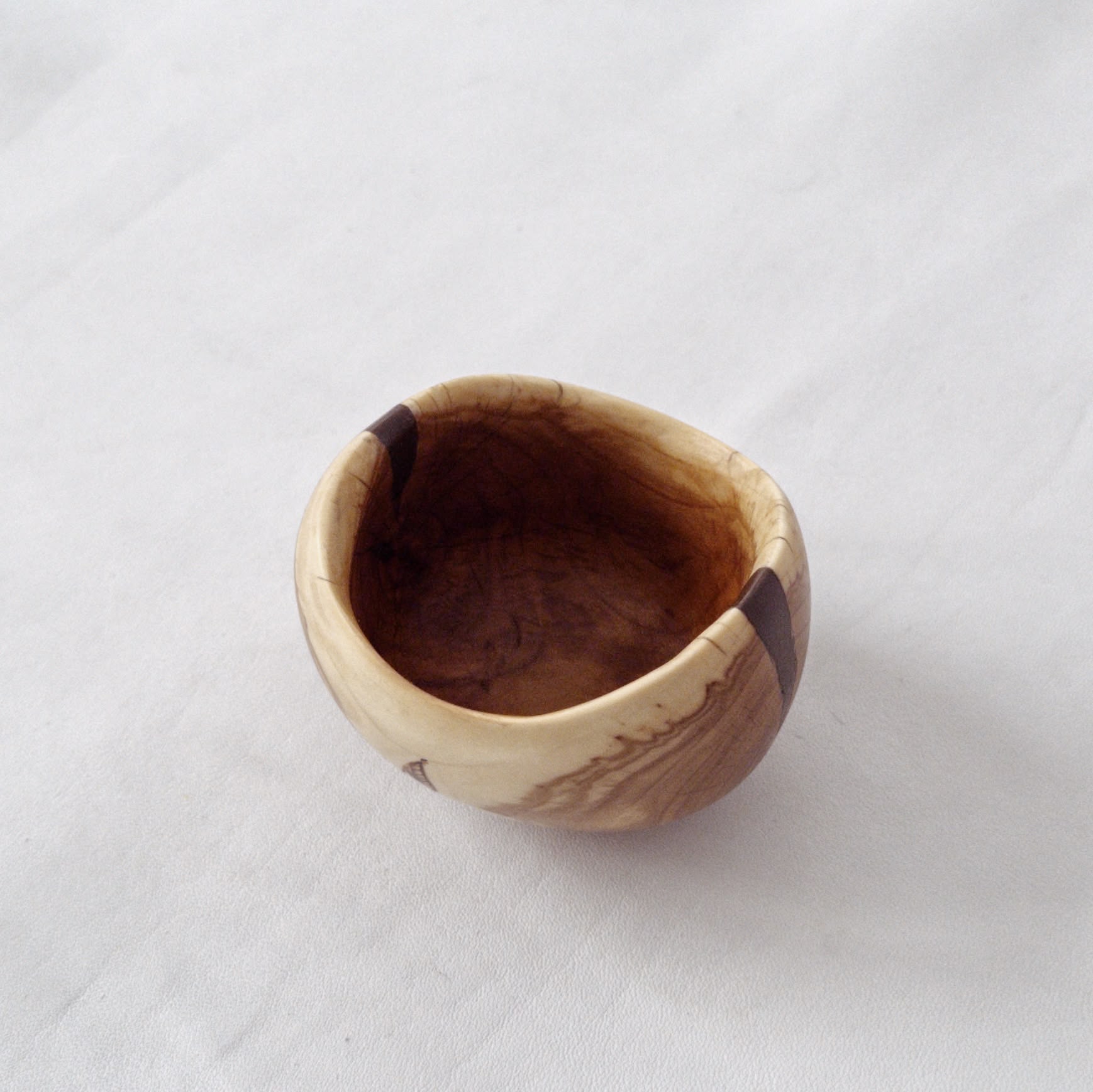 Sculptată manual prin scobirea unui trunchi de copac de liliac, păstrând contrastul dintre alburn (lemnul alb) si inima rozalie a copacului.